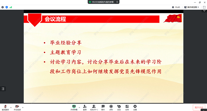 然后,进入毕业经验分享环节,五位毕业生党员同志和一名优秀的毕业年级同学为大家分享了自己的保研、工作和考研的经验。魏铱楠同志详细地分享了她在保研过程中经历的笔试面试,简单介绍了自己参加的夏令营。关岳琳同志为大家梳理了推免的时间线,分享了自己成为浙大夏令营优秀营员的经验。谭静文同志从教师就业的角度出发,梳理了教师招聘的流程,分享了很多其中需要注意的细节,并引发了大家对“心理学教师的价值”的思考。辛畅同志分享了本校保研的经验,提醒大家关注保研政策,在每个阶段都做好准备。梁静同志以视频的形式分享了自己工作保研的经验,分别介绍了工作保研的流程、优势和准备方式。韩禹晨同学从实际出发,提醒大家考研需要提前准备、善于利用资源并合理制定计划。几位同志都提到了大家作为北师大心理学部的一份子,无论是选择考研保研还是工作,都应当自信面对。大家也深刻认识到,无论未来从事什么工作,都可以以一名“心理人”的身份做出贡献。