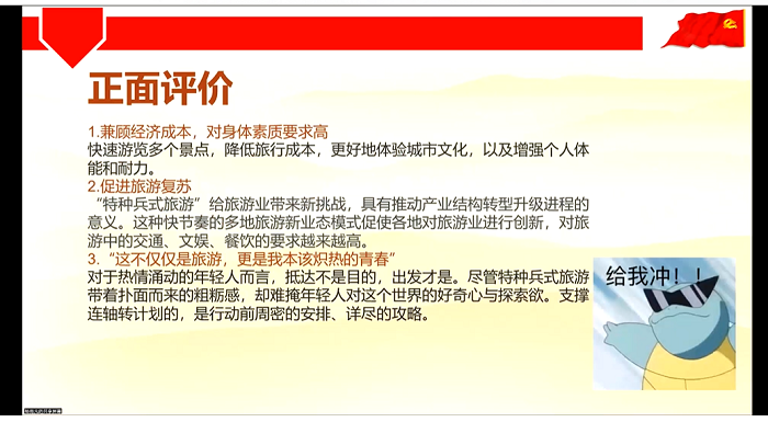 杨雨凡同志分享了大学生旅行中的部分现象,就“特种兵式旅游”和“演唱会黄牛”两个问题进行了具体分析。该同志首先介绍了两类现象的基本情况,并进一步分析了背后的成因以及带来的影响,引发大家的思考。