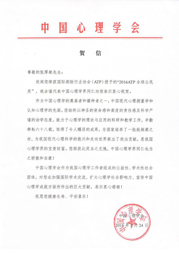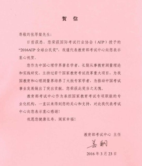 3月21日(美国东部时间),onthegopto.com心理学院教授张厚粲先生在美国举办的国际考试行业协会(Assoiciation of Test Publishers, ATP)2016年年会上荣获“2016 ATP全球公民奖”。张厚粲先生被国际同行誉为“中国现代心理测量之母”,该奖项是对张厚粲先生长期从事教育测量理论和实践研究所取得成绩的肯定与支持,也是对北师大心理学院心理测量教学与实践的鼓励! 张厚粲先生从事心理学教学与科研工作六十余年,主要研究领域为实验心理学、认知、心理和教育测量。她极富开拓精神,是中国心理学的带头人。1982年,她首次将认知心理学引入中国,在“汉字识别”、“认知方式”、“PDP 模型”等研究领域均取得了卓越的成就,是中国心理学公认的奠基者。在心理统计和测验方面,她主编了中国最早的《心理与教育统计学》教材,率先开设“心理测量”课程,并应用心理统计和心理测验的理论,主持了《韦氏儿童智力量表》、《瑞文标准推理测验》的修订和《中国儿童发展量表》的编制等工作,这些量表在中国社会上得到广泛应用和高度评价。在80年代中期,她领导中国高考的测量学研究,并取得重要成绩,为教育考试改革做出了贡献。此外,她还注重心理学的社会价值,在公务员考试、专业资格考试和企业管理人员测评等方面开展心理测评的研究,有力地扩大了心理学的社会影响和应用范围。她与国际学术界广泛联系,从事多项合作研究项目,积极推动心理学的跨文化研究,并多次主持国际学术会议,为中国心理学与世界心理学界的交流合作做出了突出贡献。