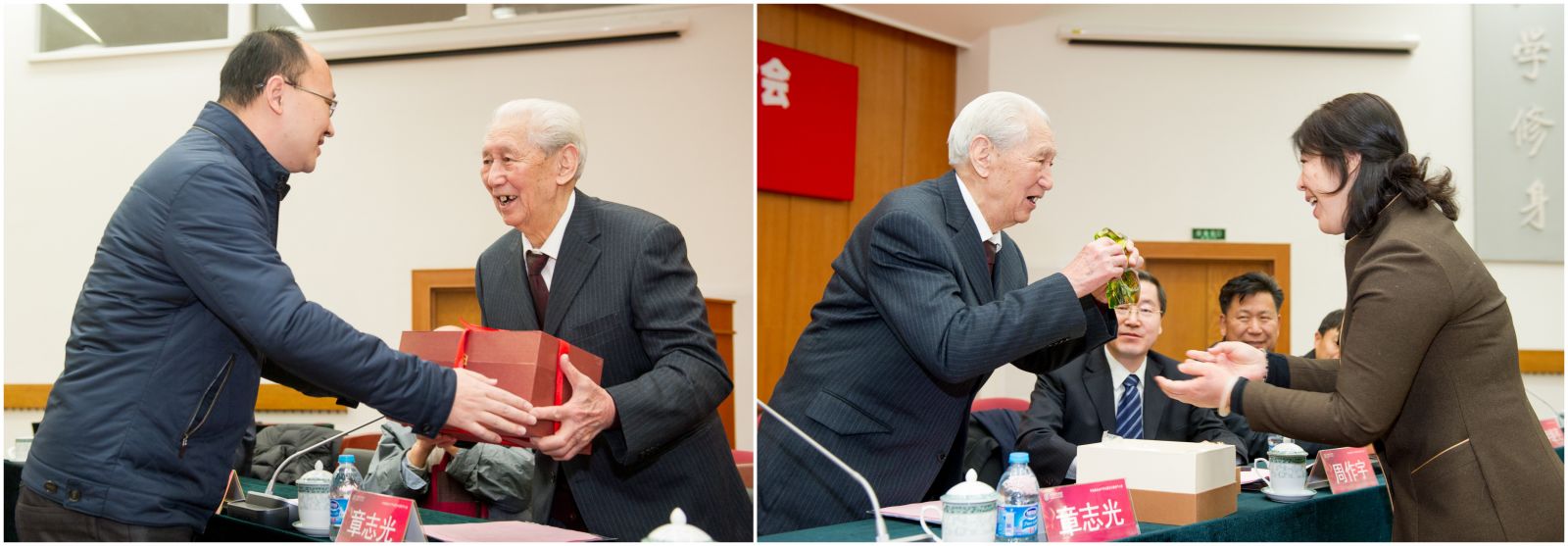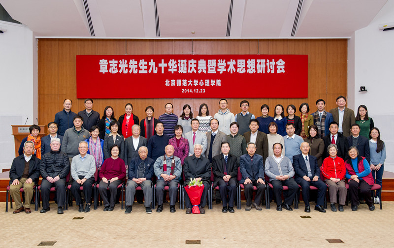 2014年12月23日上午,章志光先生九十华诞庆典暨学术思想研讨会在英东学术会堂二层演讲厅隆重举行。 图1 章志光先生九十华诞暨学术思想研讨会现场 教育部体育卫生与艺术教育司司长王登峰教授、基础教育二司副司长申继亮教授,我校副校长周作宇教授,著名的教育学家王策三教授,心理学家林崇德教授、彭聃龄教授、陈琦教授、李汉松教授等,中国心理学会副理事长白学军教授,中国社会心理学会候任理事长、北京市社会心理学会会长许燕教授,兄弟单位的刘华山教授、胡竹箐教授、樊富珉教授、孙建敏教授、苏彦捷教授、王二平教授、冯伯麟教授等出席了大会,出席大会的还有章先生的弟子、家人,心理学院院长刘嘉,分党委书记乔志宏,副院长刘力,副院长张西超,副书记王瑞敏和师生代表100余人。大会由我院分党委书记乔志宏主持。 周作宇副校长代表学校为章先生九十华诞致贺词,周校长对章先生对我校心理学科的建设和发展所作出的贡献给予了高度的肯定。刘嘉院长代表心理学院和脑与科学学院为章先生九十华诞致贺词并赠送礼物。中国心理学会副理事长白学军教授、北京市社会心理学会会长我院许燕教授也分别代表中国心理学会和中国社会心理学会、北京市社会心理学会为章先生九十华诞送上祝福。 图2 周作宇副校长、刘嘉院长、中国心理学会白学军副会长为章先生致贺词 图3 刘嘉院长代表学院赠送礼物,许燕教授代表中国社会心理学会、北京市社会心理学会赠送礼物 会上,章志光先生的弟子、我院金盛华教授介绍了章志光先生的学术成就。王策三教授、王登峰教授、章先生的弟子北京大学光华管理学院副院长张志学教授、华中师范大学心理学院院长刘华山教授、我校资深教授林崇德先生、彭聃龄教授、陈琦教授等都做了发言。 在庆典的最后,章先生进行了总结发言,他首先感谢大家的热情和祝福,并与大家分享了自己这一生感觉满意和遗憾的事情。章先生认为被培养成为高校的心理学教师,经历人生种种磨砺和考验,有一个和谐且日益壮大的家庭是一生感觉满意的重要的三件事情。“烈士暮年,壮心不已”对于遗憾的事情,章先生重点提到了自己还有很多到现在没有完成的事情,在心理学研究的漫漫征程中,自己还有很多没有解决的问题,希望广大的心理学者能继续奋战在教学和科研的前线,为心理学的发展做出更多的贡献。 图4 章先生做总结发言 图5 全体参会人员与章先生合影