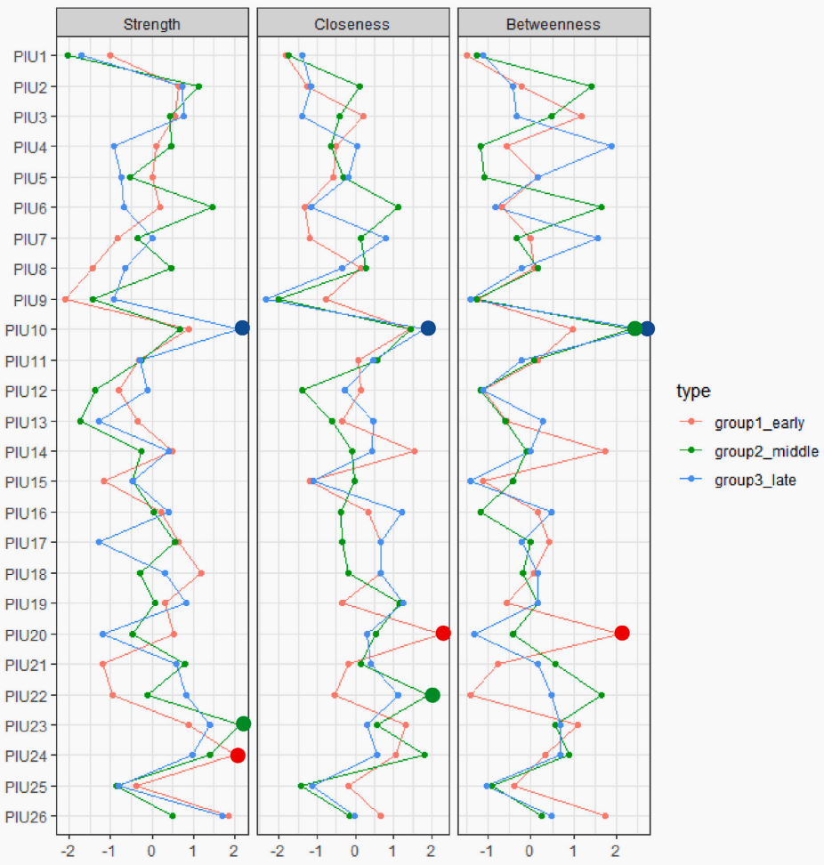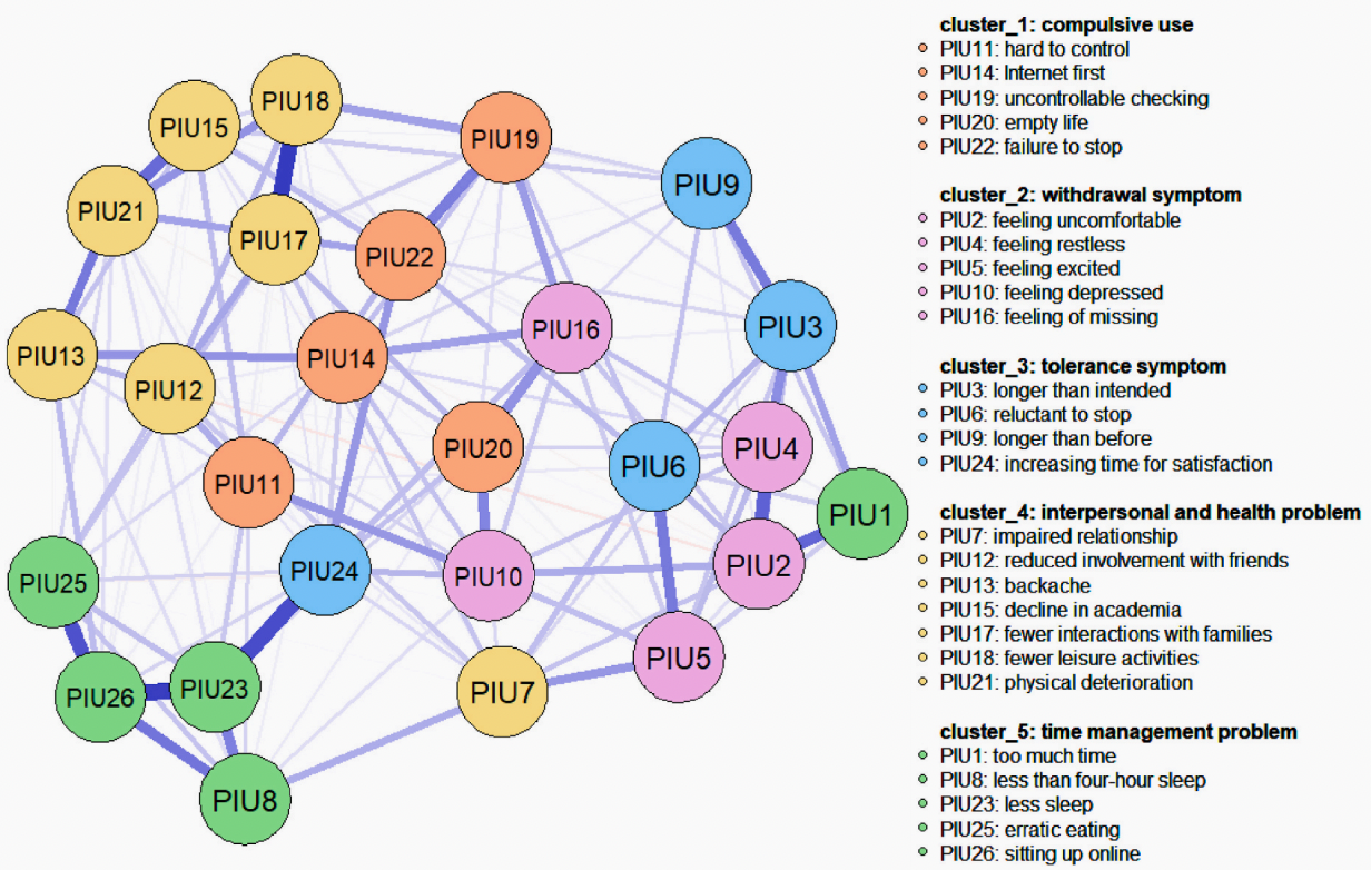 青少年问题性网络使用(又称网络成瘾)是近年来愈发常见、且对个体发展有诸多不良后果的心理问题。如何有效干预青少年问题性网络使用,是广受临床领域关注的研究问题。其中,网络病理学视角的兴起,对我们理解心理病理症状的关系、明确核心症状提供了可能。 近期,beway必威 伍新春教授课题组在实验心理学领域的高影响力(2021,3/90)期刊《Computers in Human Behavior》发表题为《Core symptoms and symptom relationships of problematic internet use across early, middle, and late adolescence: A network analysis》的研究论文。该论文采用网络分析的方法,以达到问题性网络使用临界分数的中国青少年为研究对象,考察了青少年问题性网络使用的症状网络结构,并比较了青少年早期(10-12岁)、中期(13-15岁)和晚期(16-18岁)问题性网络使用的特点。 图1 青少年问题性网络使用的症状网络结构