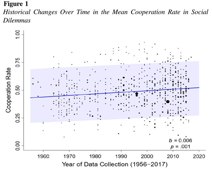 这项结果挑战了合作行为下降的观点,有力地支持合作行为的上升。研究者推测现代化的发展和个体主义(如城市化水平和独居率)的提升、社会分工和社会系统的复杂化、更加普及的高等教育和平均智力水平的上升,可能是促进人们合作行为上升的社会变迁基础。 未来研究需要进一步探讨更多国家和地区的合作行为的时代变化,以期更好地理解全球范围内不同国家和地区或文化背景下的合作行为与社会资本的变迁。这可以帮助人们深入理解社会变迁如何影响人们的心理与行为变化,也可为社会公共政策的制定提供一定的参考,因为理解人们合作行为的变化趋势并促进不同民众之间以及不同国家之间的合作行为,是人类应对全球问题(如气候变化与新型冠状病毒大流行)和构建人类命运共同体的关键因素。