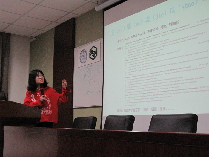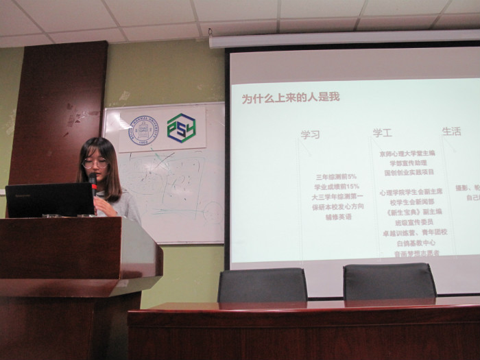 2017年10月21日晚8点,2017级心理学部本科在后主楼1420举办了学术经验交流会,本次活动由学业辅导室主办,邀请了大四的殷锦绣同学,大三的谷菲同学和屈楚烟同学,大二的季天胤同学为同学们分享.本次交流会由2017级3班学习委员邱林波主持,30余名本科新生参加了本次交流会。 首先殷锦绣同学进行了主题为“如何平衡学习与学工社团”的经验分享。她从自身的经历出发,提供了关于平衡学习和学工社团的有效方法,并推荐了两篇文章推送,让同学们懂得了自律的重要性。