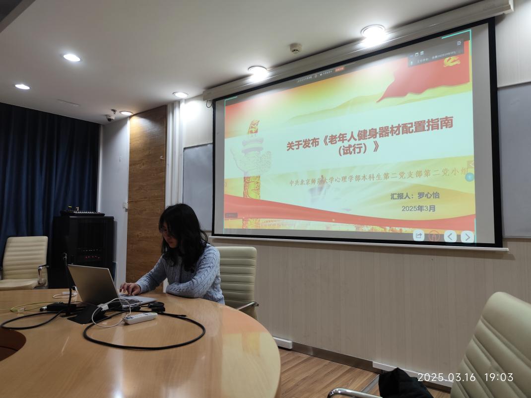 2025年3月16日19时,心理学部本科生第二党支部第2党小组于后主楼1316A召开党小组会。会议由党小组组长徐傲同志主持。 罗心怡同志围绕《老年人健身器材配置指南(试行)》展开分享,分析了我国老龄化现状及指南的核心原则,包括适老化、多样化、有效性及标准化要求,并结合案例阐述了指南对完善全民健身公共服务体系的重要意义。