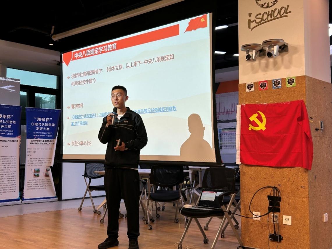2025年4月18日18时,心理学部2024级学术硕士第二党支部于金丰和路演厅顺利开展本月主题党日活动和2024级学术硕士第二团支部团日活动。会议由党支部书记程先楷同志主持。支部8位正式党员和14位积极分子到场参会,班级其他团员同学到场学习。