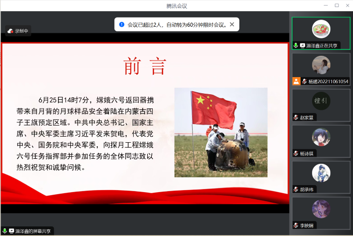 2024年7月19日,心理学部本科生第一党支部第一党小组以“72小时过境免签政策与China Travel热潮”和“嫦娥六号顺利返回”主题为主要内容,开展了本次党小组会。会议通过“腾讯会议”平台以线上会议的形式进行,由杨媛同志主持,共13名同志参与。