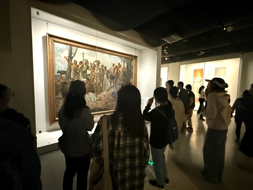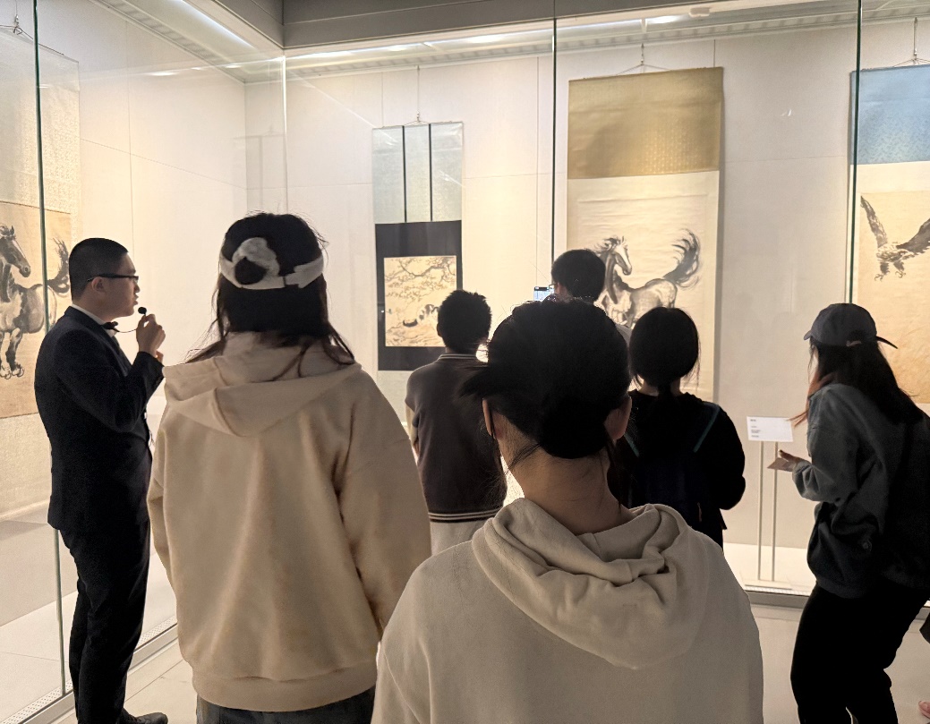 在讲解员的带领下,同学们欣赏了《愚公移山》《田横五百士》《奔马图》等经典作品。九一八事变后,徐悲鸿先生将自己的居所取名为“危巢”,时刻谨记祖国正处于危难之中,要不忘国耻,居安思危;在抗日战争时期,先生创作了《愚公移山》,以对我国传统寓言故事的再阐释,鼓舞人民团结一心,以壮士开山的精神夺取抗战胜利;在《风雨鸡鸣》图中,先生以风雨如晦的背景中挺胸昂首望天长鸣的一只雄鸡,隐喻中国共产党使水深火热中的中国人民找到了力量源泉,将带领人民走向光明;在战乱年代,先生多次赴其他国家或地区展销义卖书画,筹款支援前线。同学们从徐悲鸿先生的作品及其创作背景中,体会到了先生对国家和人民深沉的爱。