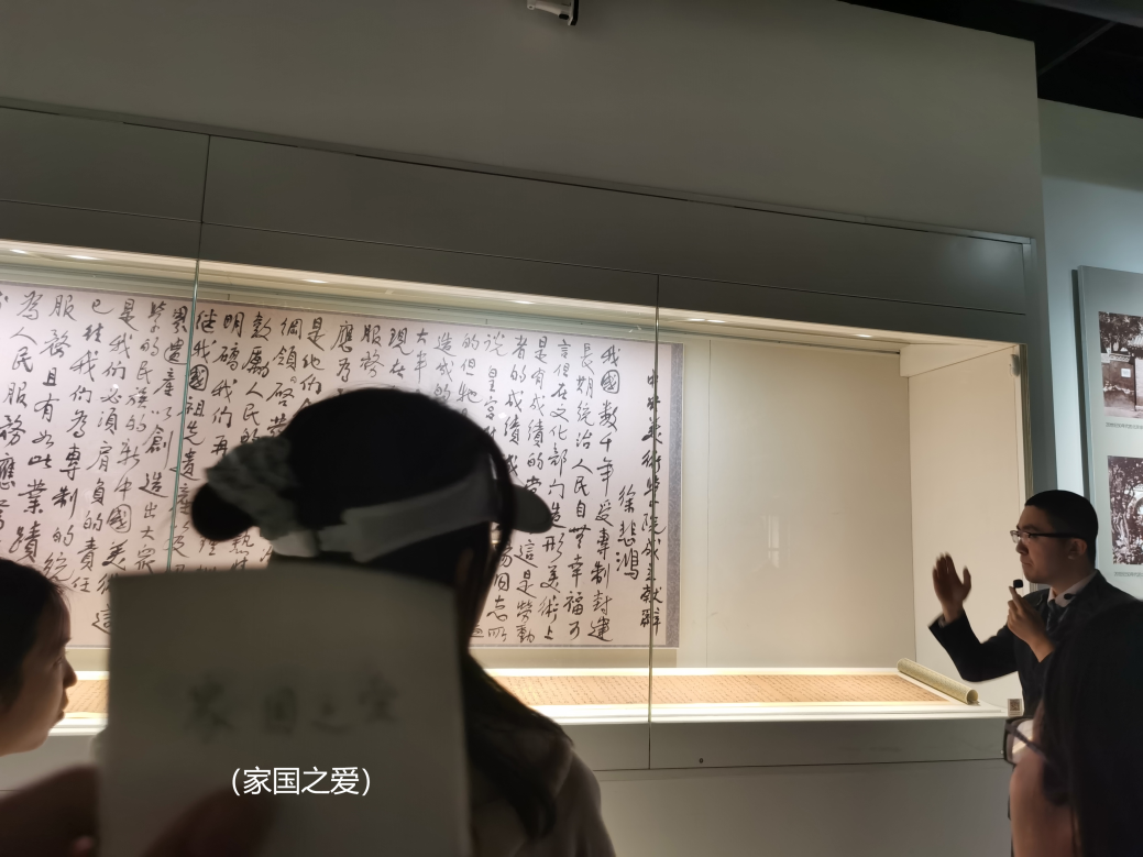 参观过程中,2023级学硕二班雪绒花使者组织大家围绕“爱”的主题进行了体悟。除了先生对国家、人民深沉的爱之外,同学们在了解到先生为画马研习解剖学、绘制近千幅素描稿,看到炸了毛的画笔与斑驳的颜料盒时,体会到了先生对专业的热爱。看到徐悲鸿先生在中央美术学院成立时的献词和资助海外留学生的资料,听到先生教导学生的故事,同学们也体会到了先生对我国美术教育事业的责任与热爱。