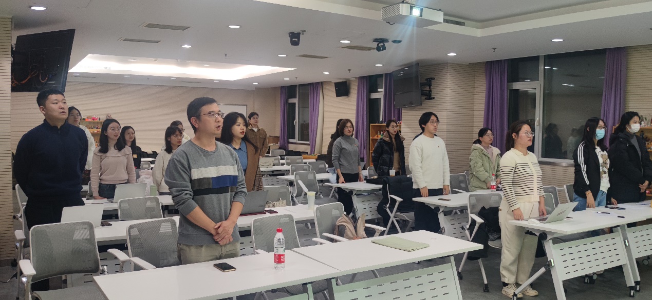 2023年12月9日18点30分至19点30分,心理学部研究生第九党支部民主评议组织生活会在后主楼1318召开。会议由党支部书记李紫菲同志主持,党支部指导老师胡思源老师亲临现场。党支部20名党员同志以及积极分子同志们均前来参会,1名党员同志线上参会。 会议开始,党支部全体成员起立,合唱《国际歌》。